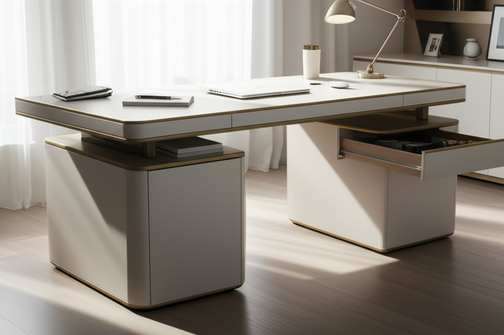 These desks often have hidden hardware and seamless drawer pulls. This contributes to their minimalist appeal. They pair well with other modern office furniture and tech gadgets. The focus is on form and function without unnecessary embellishments.