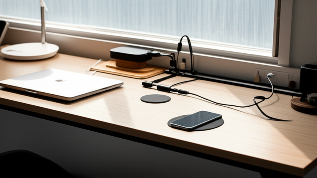 Minimalist Desk: Magnetic cable holders, small clips, and perhaps a sleek wireless charger.