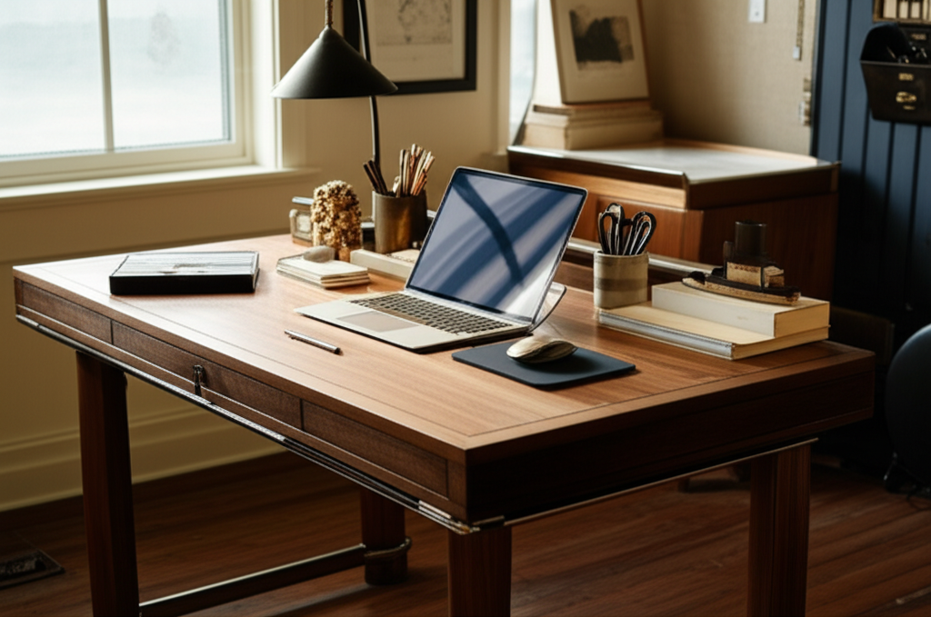 Ensure good lighting to highlight the desk’s details. Natural light is ideal, but a stylish desk lamp can also add ambiance. The goal is to create a harmonious and inspiring environment.