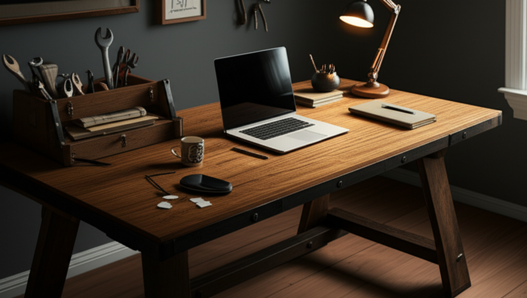 This blend of old and new creates a balanced workspace. It offers the best of both worlds. You get the warmth of natural materials with the convenience of modern tools. This enhances both the functionality and the appeal of your desk.