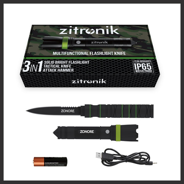 The zitronak gadget is multifunctional perfect for self-defense during the emergency. The rechargeable device is approachable with convenient assembling options, therefore, the consumer can convert it into a torch or knife or both if necessary. The led, 800LM LED light is installing with three adjustable light levels moreover the focused beam, floor light and zoom in light options are existing for the purchaser. The zitronik flashlight knife is waterproof plus occupying up to 500 feet distance. Dashing ahead the aluminum knife with the super sharp blade is 3.5 inches in length. A hammer characteristic is a highlight of the product so it’s strong enough to break a glass in case compulsory. 13.6 ounces in weight the revolutionizing gadget is admirable along with compulsory for traveling alone, hiking or visiting a suspensions place. Undoubtedly, Zitronik is one of the awesome self defense tools.